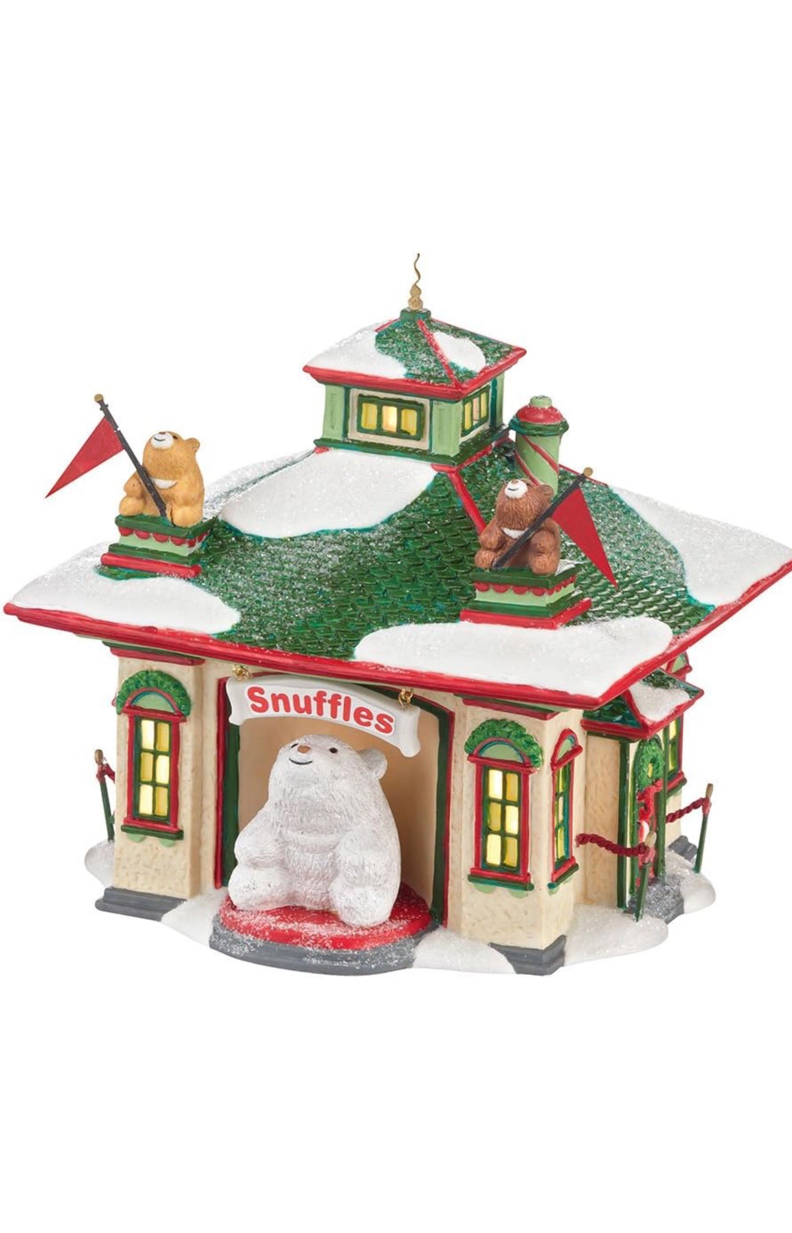 A part of the North Pole Collection, designed by Department 56 - inspired by magic and charming legends. Inspired by the famous Gund ® bear, Snuffles, anyone can stop for a special Christmas hug! Hand-crafted & hand-painted porcelain lit building.